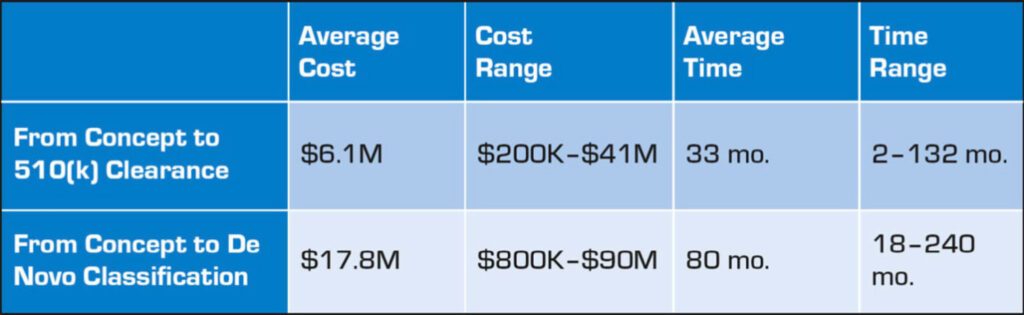 Too often, great ideas fail due to limited funds and resources. Timelines extend and costs naturally increase. With medical devices, including biosensors, costs and timelines vary significantly depending on factors such as complexity and product risk classification. The average cost of developing a medical device ranges from $6.1 million to $17.8 million depending on regulatory classification, with an average timeline to completion ranging from 33 to 80 months (see Table 1).