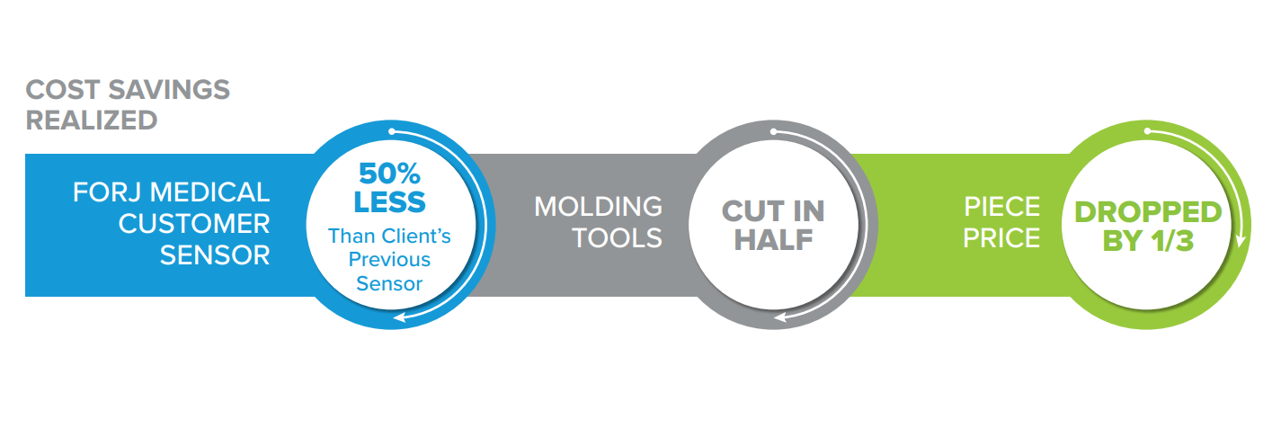 Rather than an off-the-shelf sensor, Forj Medical’s in-house engineers designed a custom, highly-manufacturable sensor in three weeks that cost 50% less. The team also developed efficient molding and assembly processes that guaranteed accurate, consistent sensor placement, reliable performance, and significantly reduced costs. Although the project scope initially covered the EM sensor only, the Forj Medical team provided not just a superior sensor, but also a valued-added assembly, molding, and attachment—ultimately, a fully functional device ready to be sent to the client’s customer. By leveraging Forj Medical’s DFM and vertical integration expertise, the client was thrilled with the efficiency f receiving a comprehensive custom solution of superior quality and minimized cost from a single CDMO partner.
